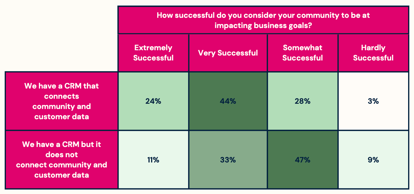 “Community teams with CRM-connected data are seeing and feeling more success. They’re twice as likely to rate their impact as “extremely successful” (24%) compared to teams with systems that are not connected (11.5%). And only 3.5% described their success as minimal, compared to over 9% in the unconnected group.”
